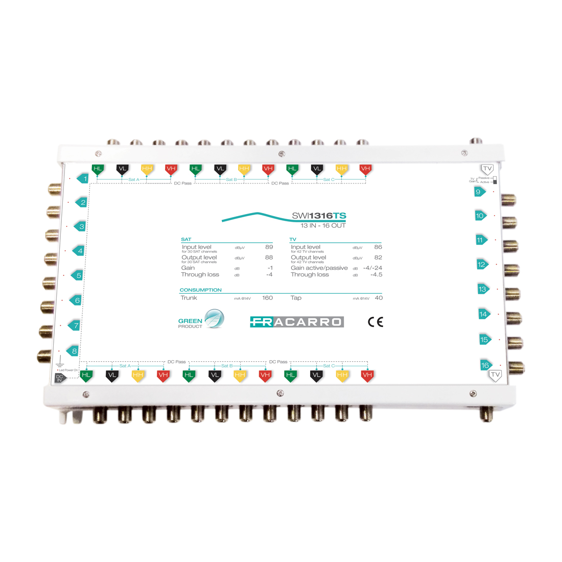 | Opis: | 13 Inputs 13-input cascadable multiswitch with 16 output taps; dip switch to select active and passive TV gain. Technical chars Satellite band up to 2300MHz. High output level to cover long cable distances(60m with 6.7mm cable). Each port has an LED to show correct reception of DiSEqC commands. Return channel included when TV gain is passive (5-65MHz). When TV gain is passive, the product is fully powered by the receivers, the power supply only serves to power the active TV gain, other amplifiers and LNBs. PSU1340TS external power supply (13V, 4A) with Male Jack connector (2.1x5.5x12; inside positive, outside negative) not included in the package; to optimise installation space and reduce maintenance time. Small size due to matrix switching system, with connectors on both sides. Easy to install due to standard input colouring SWI1316TS Code 287367 Inputs 12 SAT, 1 TV Outputs 12 SAT, 1 TV Taps 16 SAT Bandwidth MHz 950-2300 Gain dB -5/-1 Max Output level dBµV 100 Insertion loss dB -1/-5 TV TV bandwidth MHz Active TV: 47-862; Passive TV: 5-862 Gain (Active) dB -4 Gain (Passive) dB -24 Max Output level dBµV Active: 95 Insertion loss dB -4/-5 Return path Bandwidth MHz TV passivo: 5-65 Consumption Tap mA 50 Current consumption mA Active TV: 160@13V; Passive TV: entirely fed by the receiver Maximum power supply current SAT mA Passive TV: 4000; Active TV: 3840 Features Dimensions mm 190x310x40 Working temperature °C -10÷+55 SAT-SAT Isolation dB >30 Dimensions and packaging Pcs 1 EAN code 8016978097159 Packaging dimensions mm - LxWxH 330 x 245 x 50 Packaging weight Kg 1.2 |