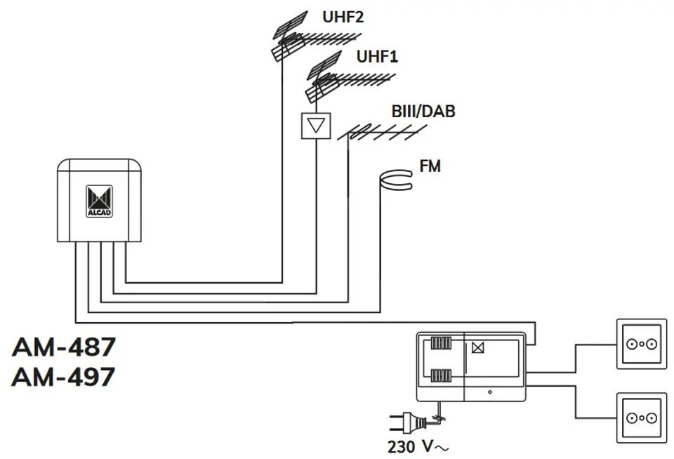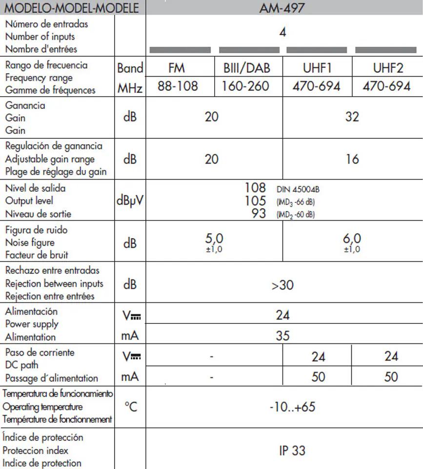 | Opis: | Multipojasno pojačalo sa 4 ulaza sa odvojenim napajanjem LTE 700 BO-497= AM-397 + AL-100 Pojačalo AM-397: Ulazi: FM 88-108MHz, pojačanje 20dB, regulacija 20dB BIII/DAB 160-260MHz, pojačanje 20dB, regulacija 20dB UHF1 470-694MHz, pojačanje 32dB, regulacija 16dB UHF2 470-694MHz, pojačanje 32dB, regulacija 16dB Izlazni nivo: 108 dBµV DIN 45004B 105 dBµV IMD3 -66dB 108 dBµV IMD2 -60dB Šumni broj: 5dB/6dB Napajanje: 24V/30mA Prolaz napajanja za predpojačalo na UHF 1 i UHF2: 24V/50mA Radno područje: -10...+65 C Zaštita: IP 53 AL100 napajanje: Broj ulaza: 1 Broj izlaza: 2 Frek. područje: 47-862MHz Izlazni napon/struja: 24Vdc/100mA Napajanje: 230Vac, 50/60Hz Snaga: 4VA Radno područje: -5...+55 C Zaštita: IP 30 |